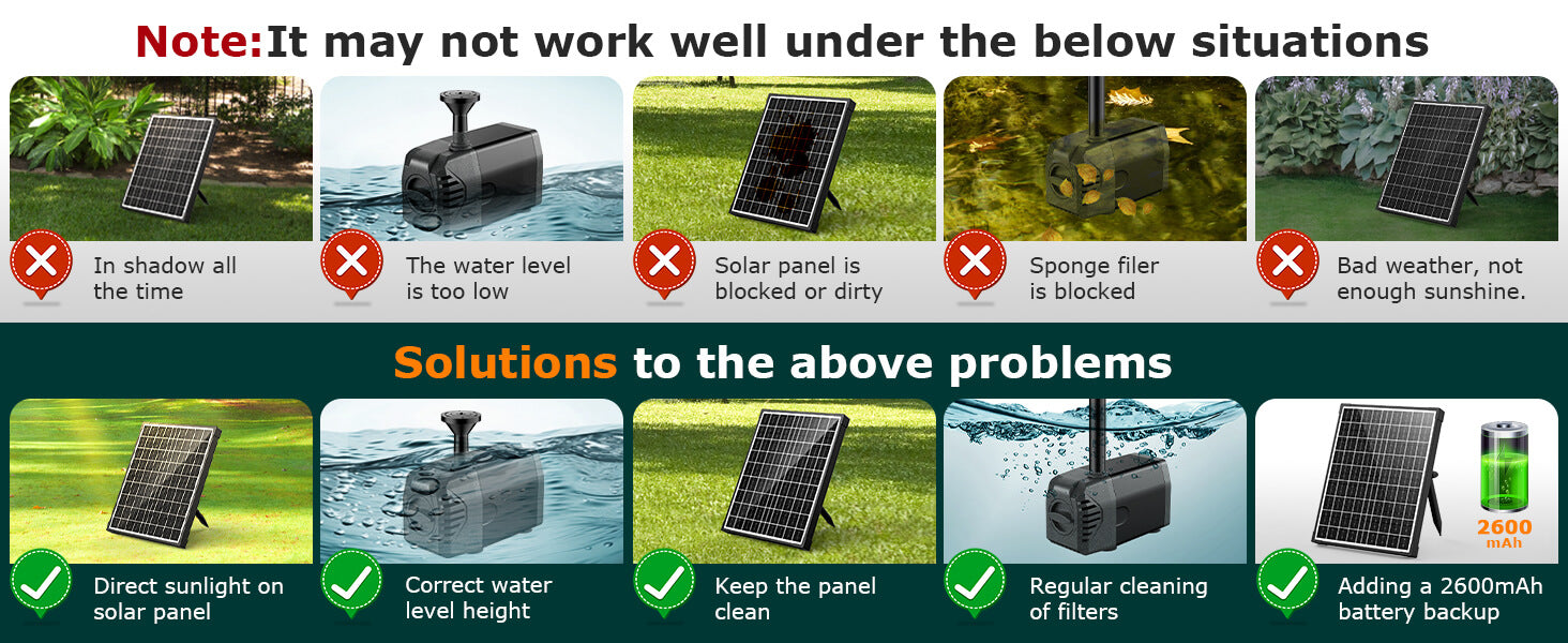 Versatile, Tips: Solar fountains are perfect for ponds, safaris, fish tanks, waterfalls, hydroponics and water circulating oxygen, etc. Please heat, 1. The solar pond fountain will not work at night and will be completely cloudy; Clean the water pump regularly to prevent the water pump from being clogged by dirt; 3. The pump needs to be submerged in water to make sure the solar panels are not blocked.